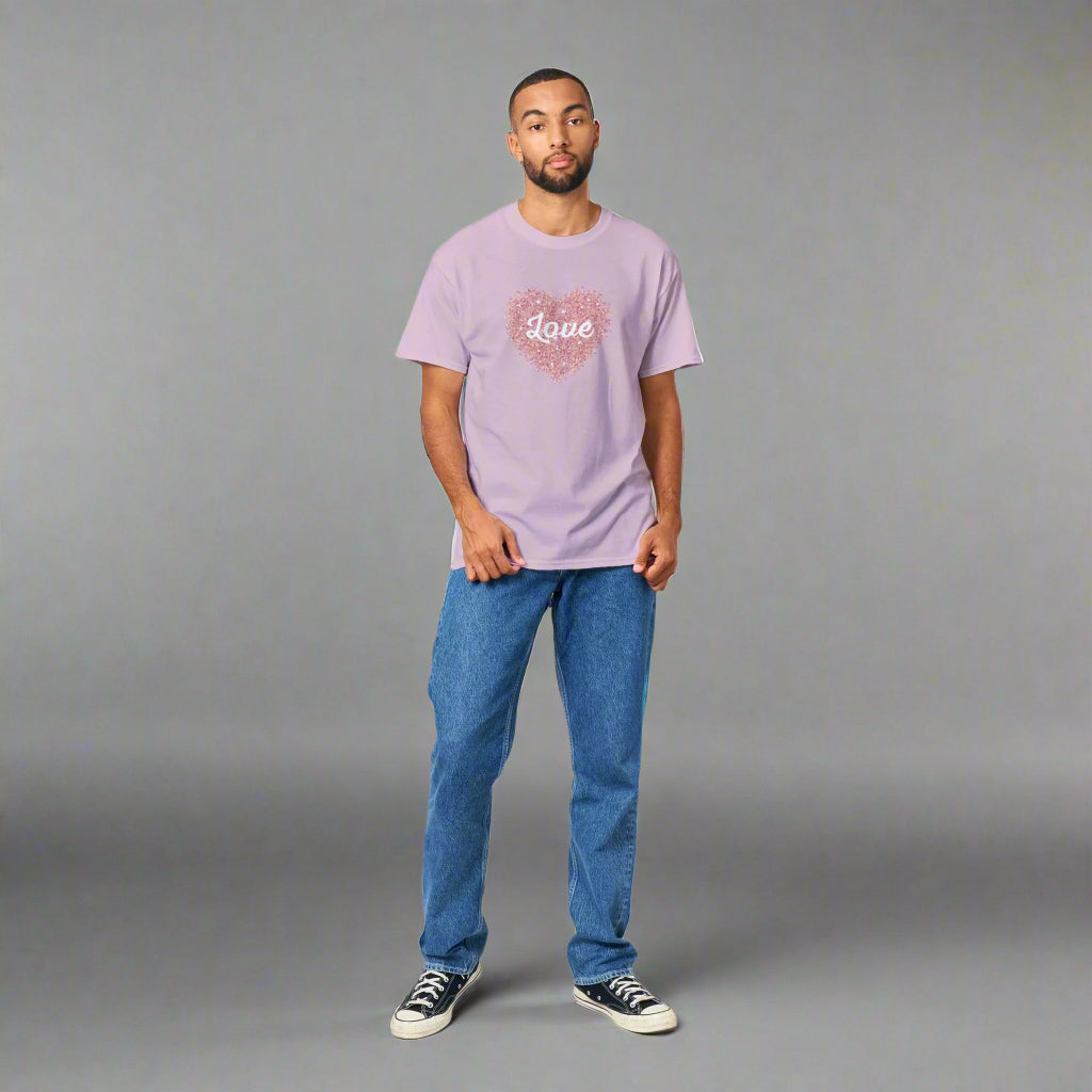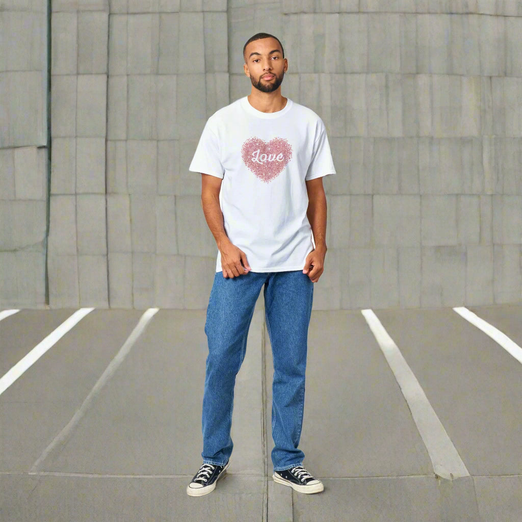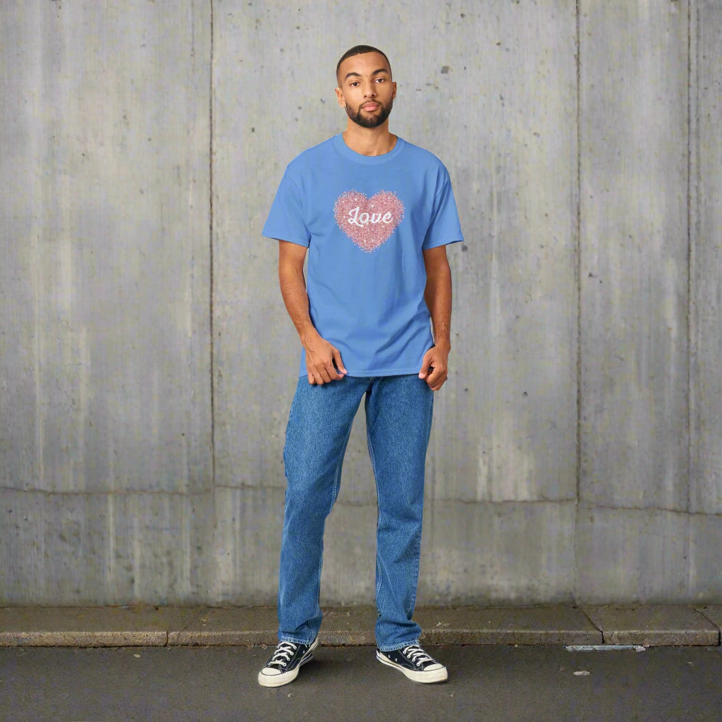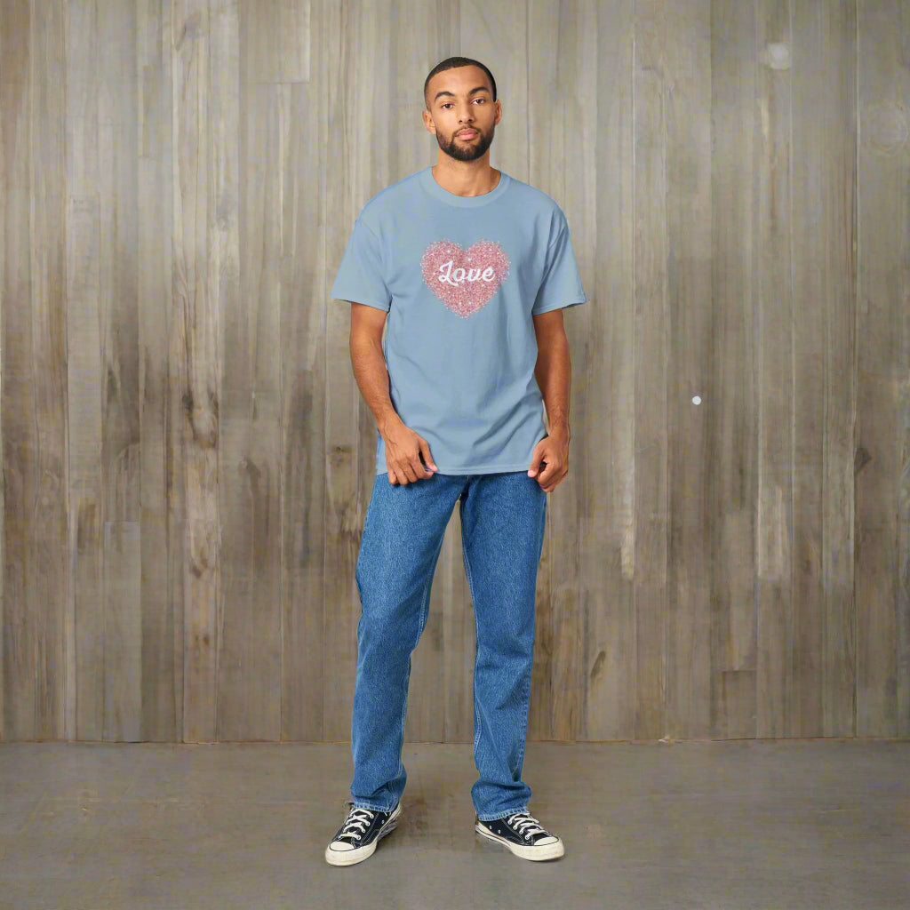 This love hear t-shirt is a durable staple product with a classic fit. It has a relaxed style made for everyday and casual wear